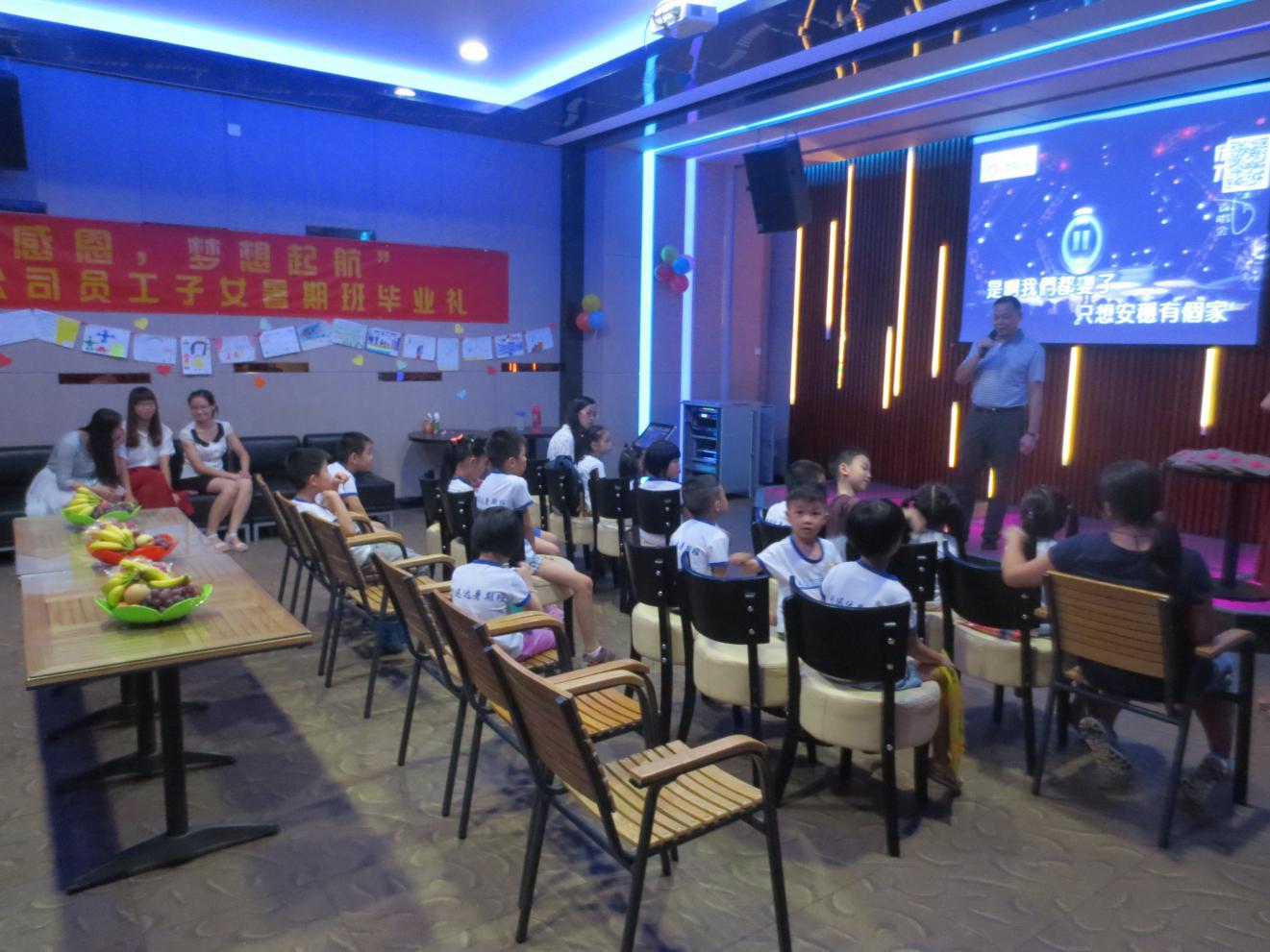 现场播放了暑期班小朋友的生活、学习情况的视频。这里虽然不是正规的教育机构,但是公司为小朋友购置了很多学习用品、聘情了两名老师,还有专门的后勤、安全岗位去协助暑期班的顺利开展,让员工家长们可以安心地工作,小朋友们又可以安全愉快过暑期,员工们都表示很感谢公司为他们,为孩子所做的一切。