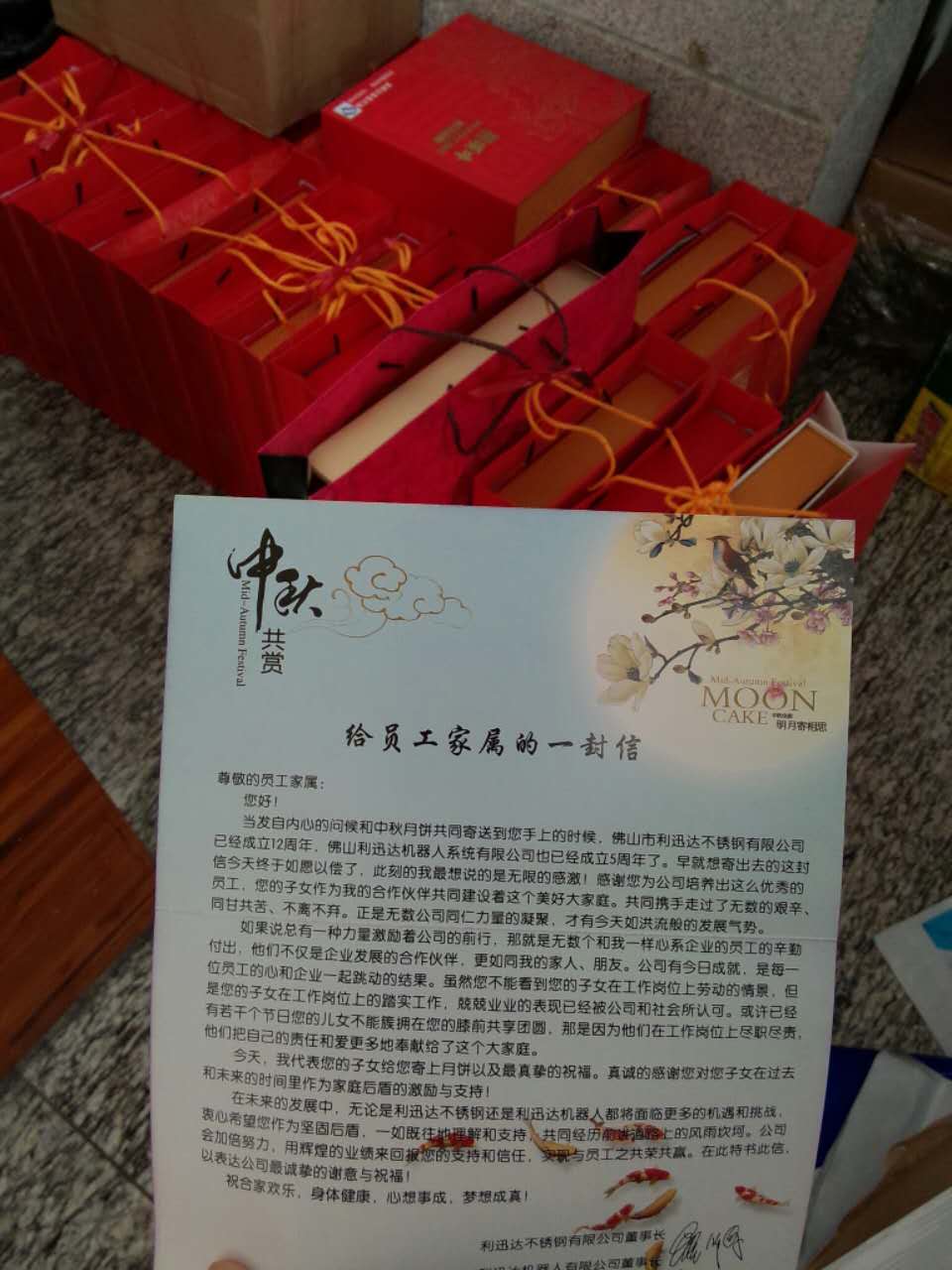 月到中秋分外明,每逢佳节倍思亲。在传统佳节中秋节来临之际,公司考虑到很多同事因工作、路途原因不能在假期回家跟父母团圆。公司以关爱、包容、感恩的心去待全体同事,关怀全体同事佳节思亲盼团圆的情怀,特策划“月饼慰亲恩,贺卡送祝福”——利迅达公司给全国各地员工家属邮寄月饼和贺卡的活动。